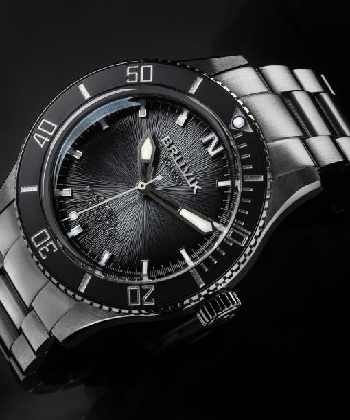 Bruvik Svalbard Arctic Fjords Black Stream Dial er produsert i børstet stålkasse på 41mm, med en redusert høyde på 11.2mm. Den dreibare bezelen er oppgradert til keramikk og har indekser fylt med Super LumiNova. Bruvik har oppgradert urverket med et sveitsiskprodusert Sellita SW300-urverk, som byr på 56 timer gangreserve og en imponerende gangnøyaktighet.