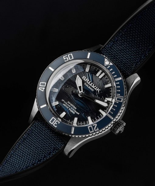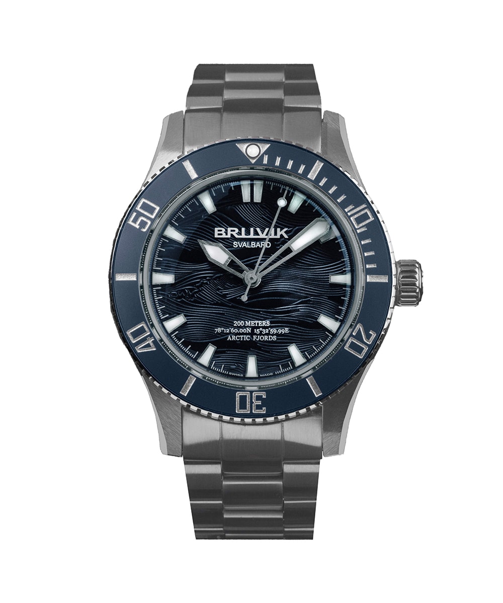 Bruvik Svalbard Arctic Fjords Blue Wave Dial er produsert i børstet stålkasse på 41mm, med en redusert høyde på 11.2mm. Den dreibare bezelen er oppgradert til keramikk og har indekser fylt med Super LumiNova. Bruvik har oppgradert urverket med et sveitsiskprodusert Sellita SW300-urverk, som byr på 56 timer gangreserve og en imponerende gangnøyaktighet.