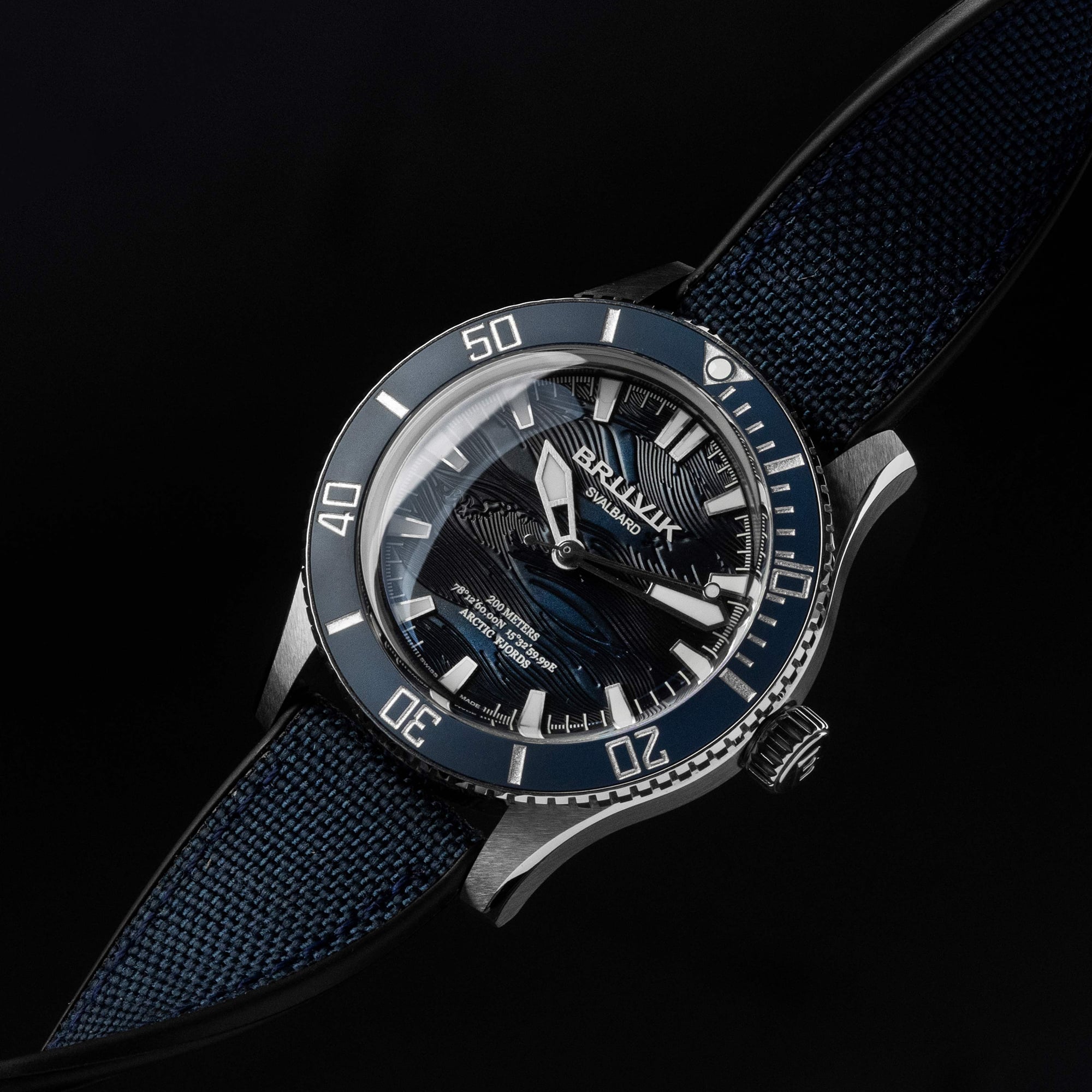 Bruvik Svalbard Arctic Fjords kommer i to varianter og farger, og i blå Wave Dial har vi uret i serienummer 007. De to forskjellige tallskivene er kjent som «Wave Dial» og «Stream Dial». Wave Dial er inspirert av de fire arktiske havene som strømmer inn i fjordene på Svalbard, mens Stream Dial trekker inspirasjon fra istidens isformasjoner som skar ut unike arktiske fjorder på Svalbard.