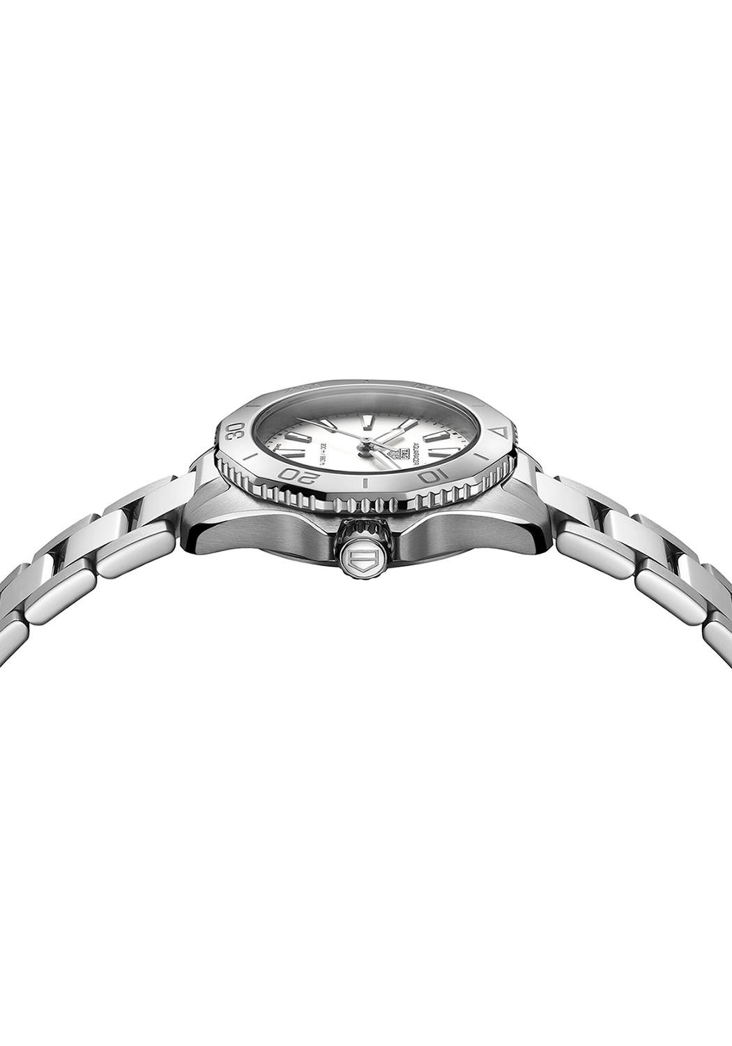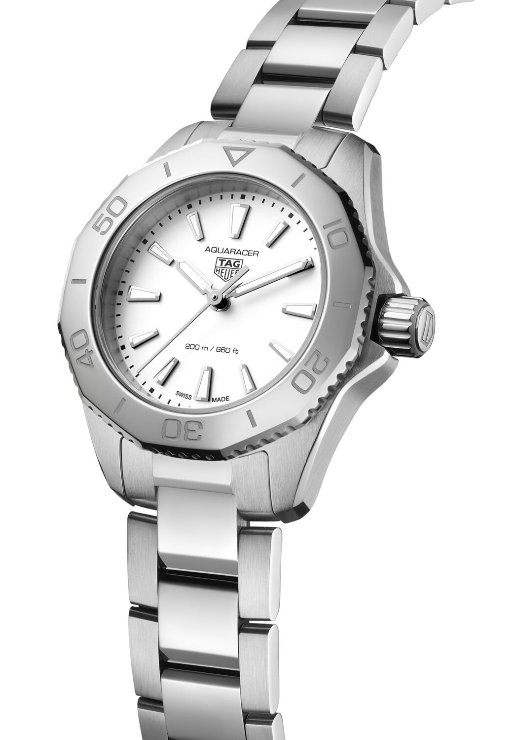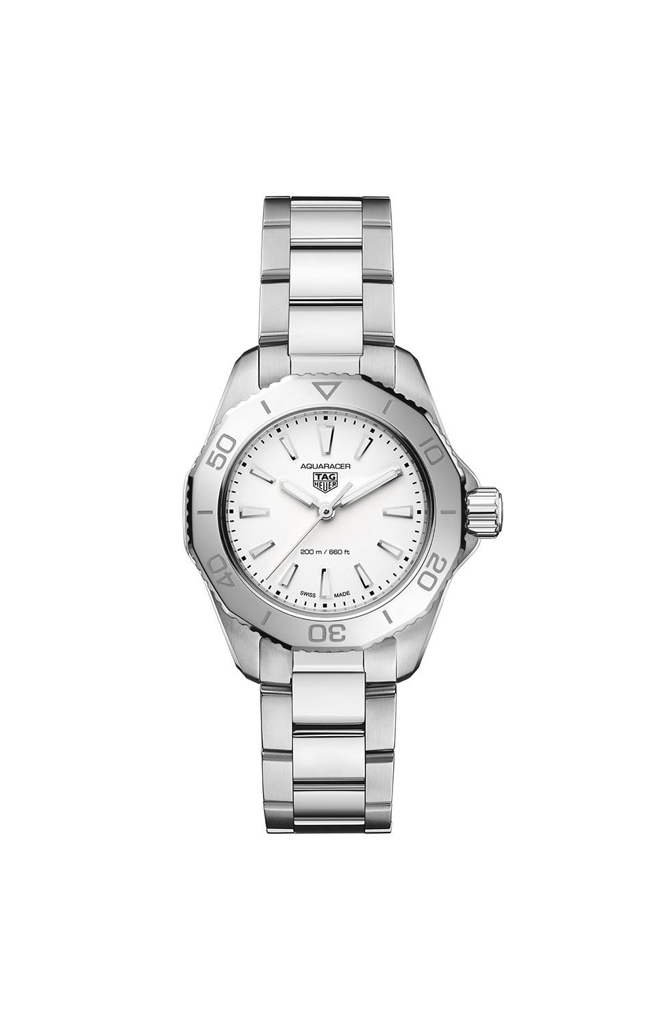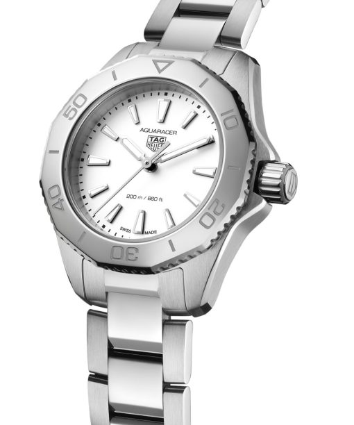 TAG Heuer Aquaracer er en klokke designet for hverdagsbruk og tøffe utfordringer. Denne allsidige modellen kombinerer funksjonell eleganse med en tidløs stil som oppmuntrer til å strekke egne grenser. Med sin 30mm diameter på kassen og en skimrende sølvfarget urskive, utstråler den både styrke og særpreg.