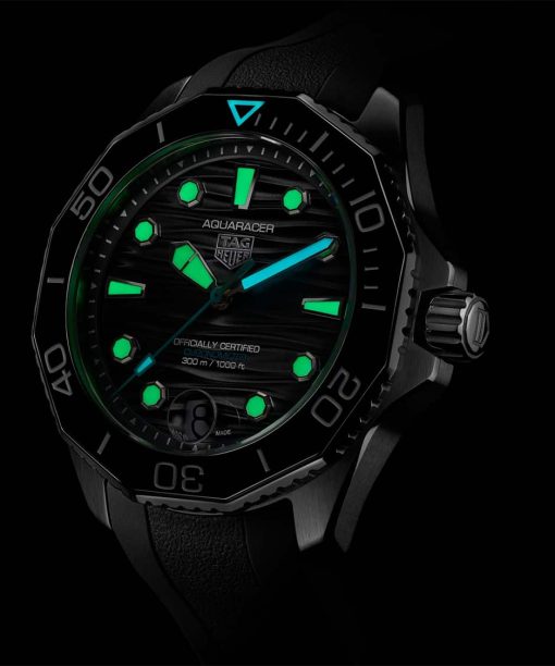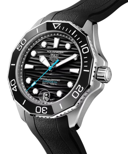 «TAG Heuer Aquaracer Professional 300 Date» kombinerer elegant design med robust funksjonalitet. Urets sorte urskive med flott bølgemønster, selvlysende indekser og visere, samt lyseblå sekundviser henter inspirasjon fra havdypet. De tydelige viserne og åttekantede timemarkørene fylt med Super-LumiNova® sikrer utmerket lesbarhet i mørket.