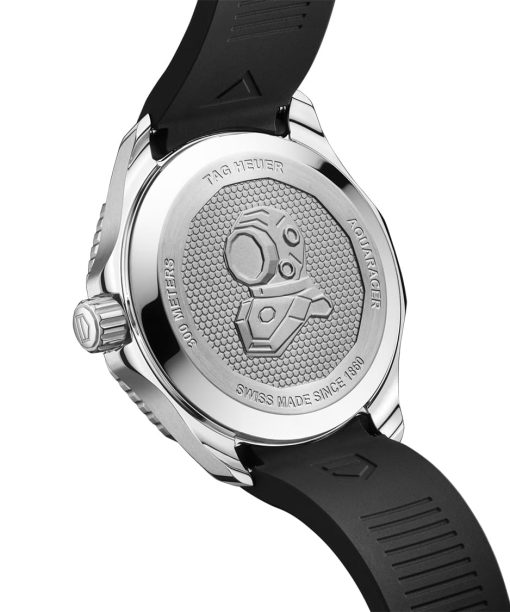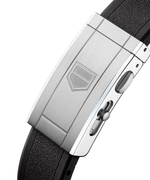 The watch’s robust case has a black ceramic bezel, with a 60-minute scale and unidirectional rotation. The bezel is easily rotatable for easy use. The black rubber strap comes with a folding buckle and TAG Heuer emblem on the clasp.