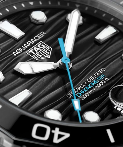 «The TAG Heuer Aquaracer Professional 300 Date combines elegant design with robust functionality. The watch’s black dial with a beautiful wave pattern, luminescent indexes and hands, and light blue seconds hand take inspiration from the ocean depths. The clear hands and octagonal hour markers filled with Super-LumiNova® ensure excellent legibility in the dark.