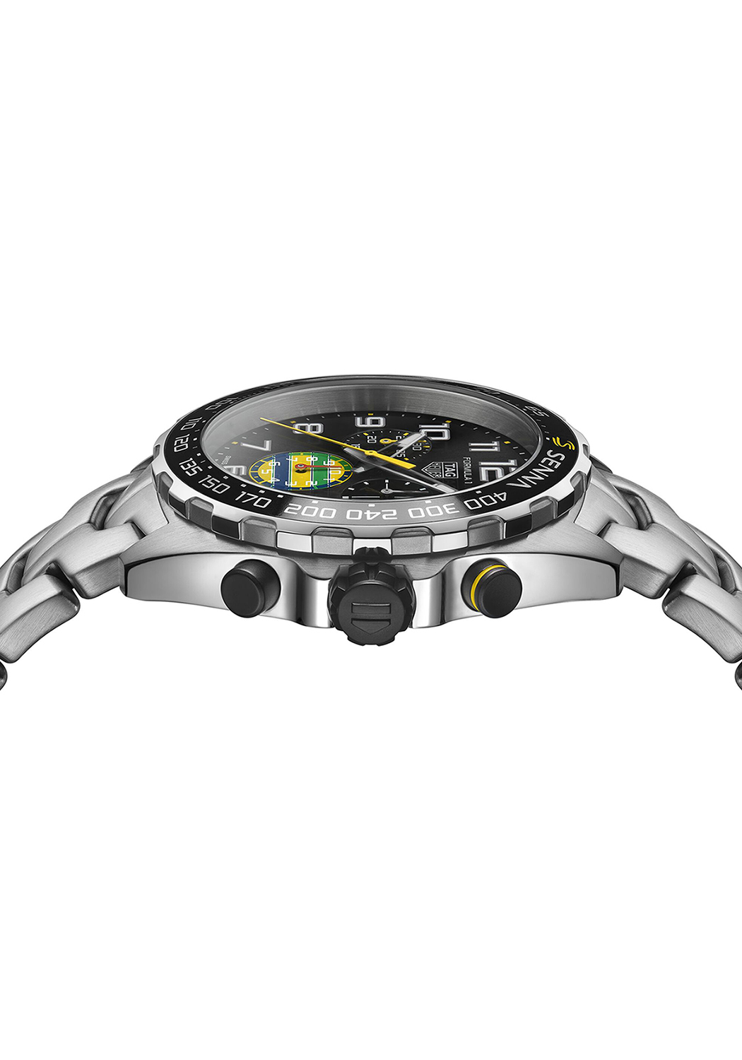 Den sorte sunray-børstede urskiven prydes av gule, røde, grønne og blå aksenter på 1/10-sekunds kronografen klokken 6 – en tydelig referanse til fargene knyttet til Ayrton Sennas legendariske racingarv.